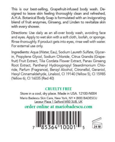 I then shower with Mario Badescu AHA botanical body wash. This wash is good and gentle but exfoliating. I use my Korean Italy towel to rub the soap on my body. The AHA (alpha hydroxy acid) inside of the soap gently exfoliates the skin chemically, while using the body scrub mechanically exfoliates the skin.